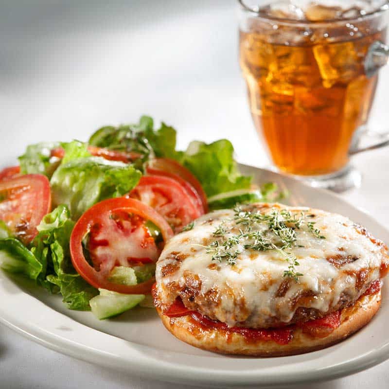 Old school pizza burger plated with fresh side
